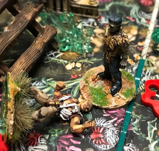 The ruins of Castle Frankenstein with pit falls and perils to make it interesting, 4 plot points in crates and a major in the center of the table only accessed once you have a minor point. GW scenery and sorted solo cards and dice.
